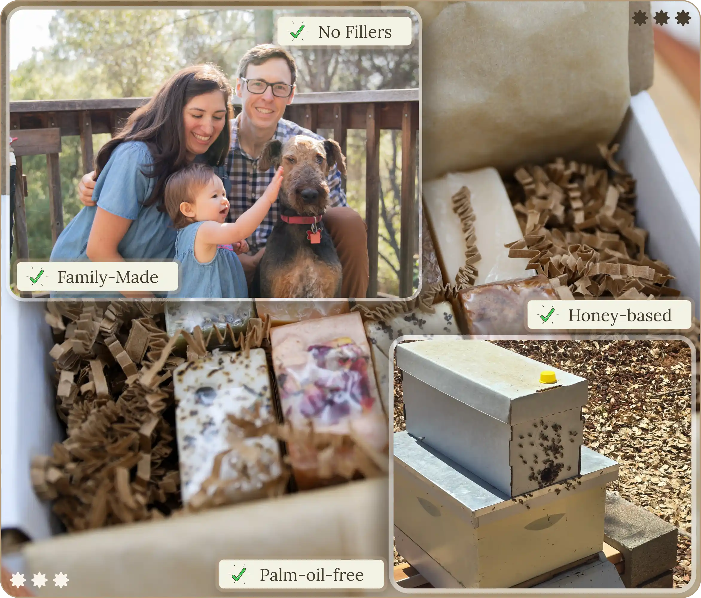 Honey-infused bars made by hand for families who care what touches their skin. No palm oil. No synthetics.